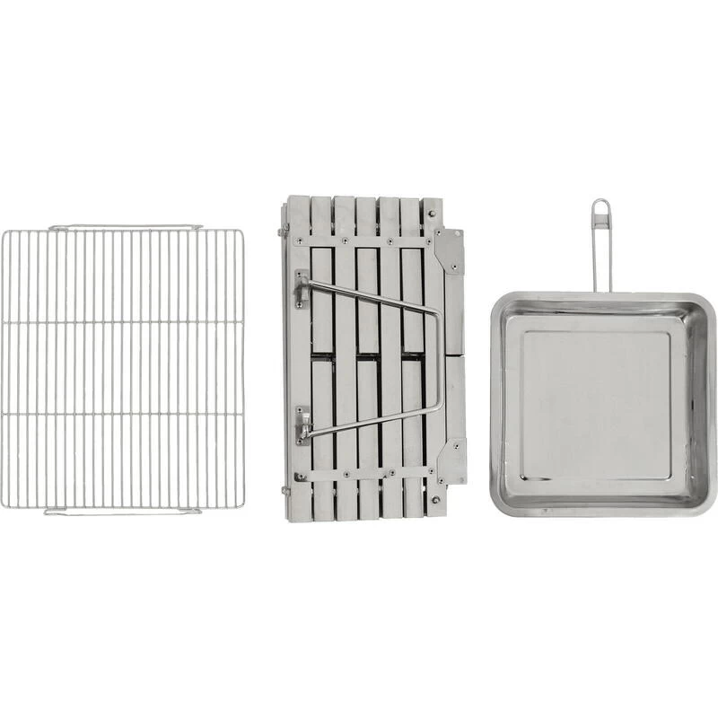 Gril pliable robuste en acier inoxydable avec hauteur de charbon réglable. Utilisable à la fois comme gril et foyer. Facile à assembler, sac de transport pratique. Plaisir de griller maximum !